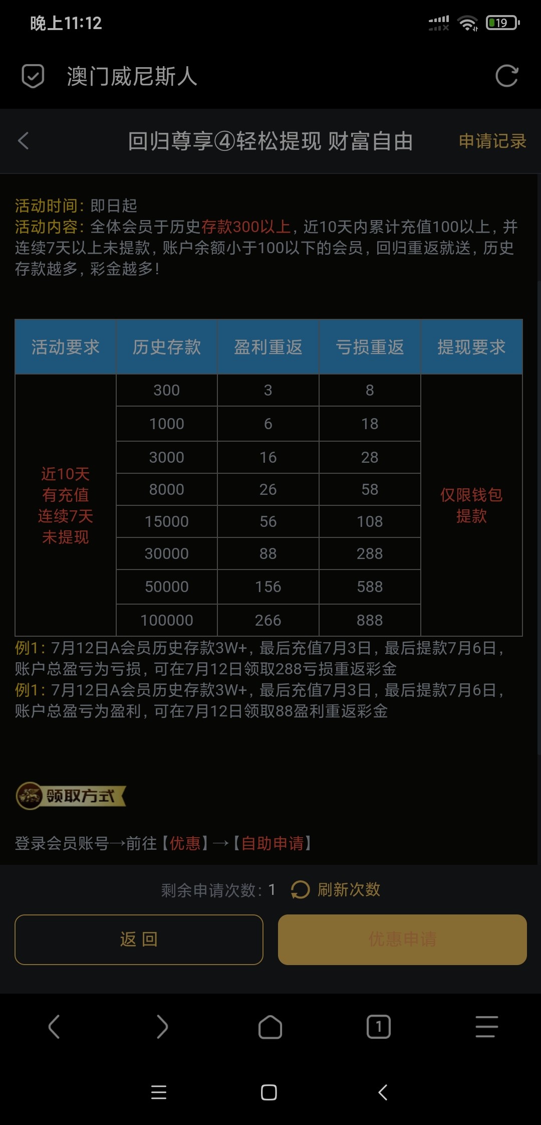注意规则!要以前充值过,最近7天没提款,活动回归礼里面第四个自助申请。我申请到了。注意规则,不符合骂轻点!