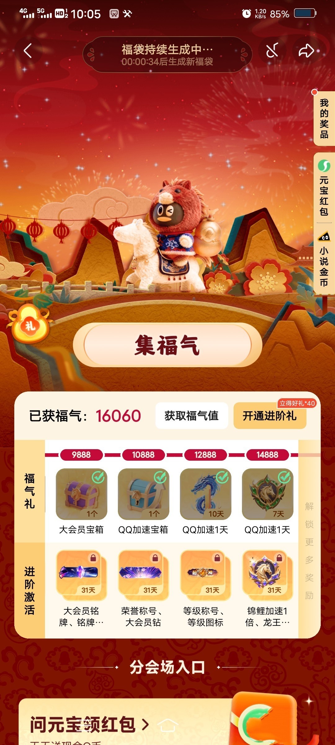 qq春节红包,入口在q首页上面,最后一张图上有,一直点福气礼包就行,有的有钱,只要钱就行了。我一会领了24,每天都有,现在估计没水了。有水了再去。