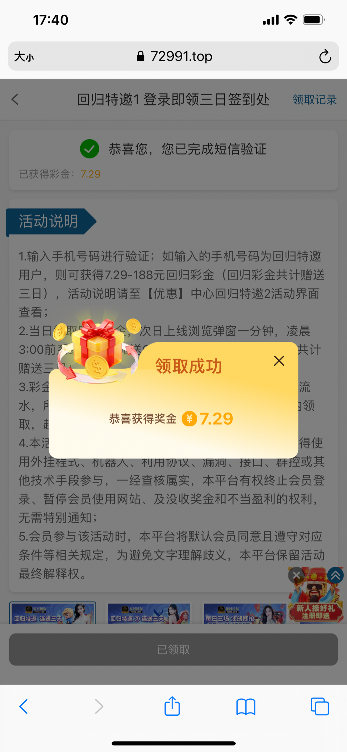 刚才接到电话说召回领三天彩金,之前领过一次,不知道为什么又有了