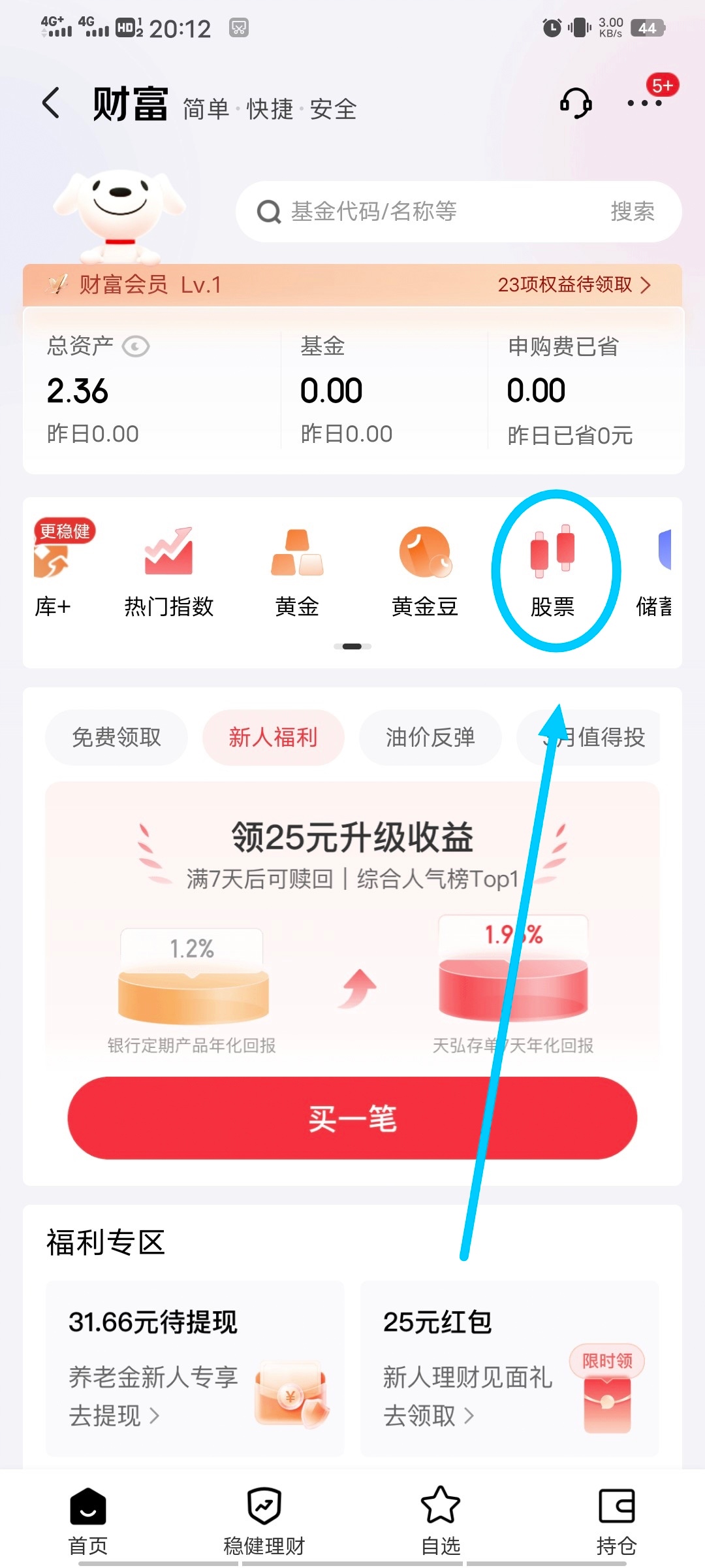 打开京东-我的–钱包-财富-股票