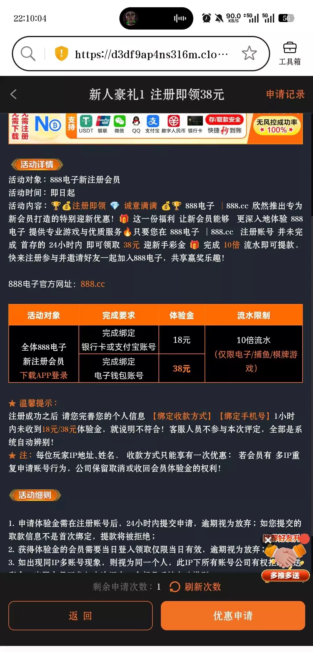 下载app绑定银行卡送18,绑定电子钱包送38,申请成功在待领取那里,没出来就重新进就有了 官网888.cc